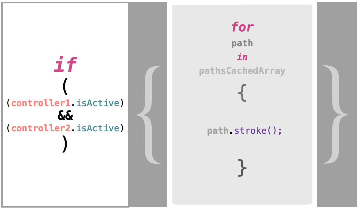 An if statement encloses a for loop, arranged in such a way that the presentation is better suited for very long files. (2X zoom, Redesign.Codes method).