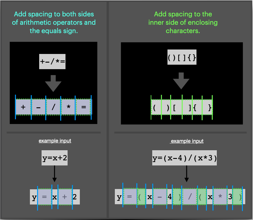 y=x+2+zcannot be kept in such a compact form and also stay readable. Inserting and removing spaces is a source of fatigue, and a solution is to pre-pad certain characters so that spacebar and delete do not have to be pressed.