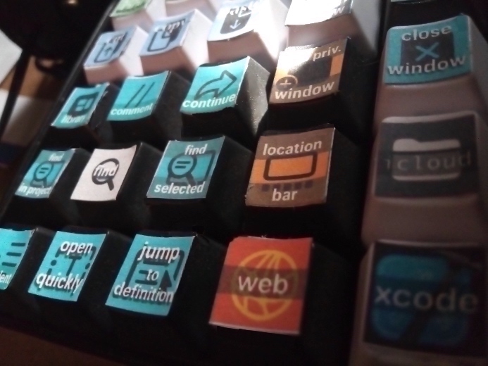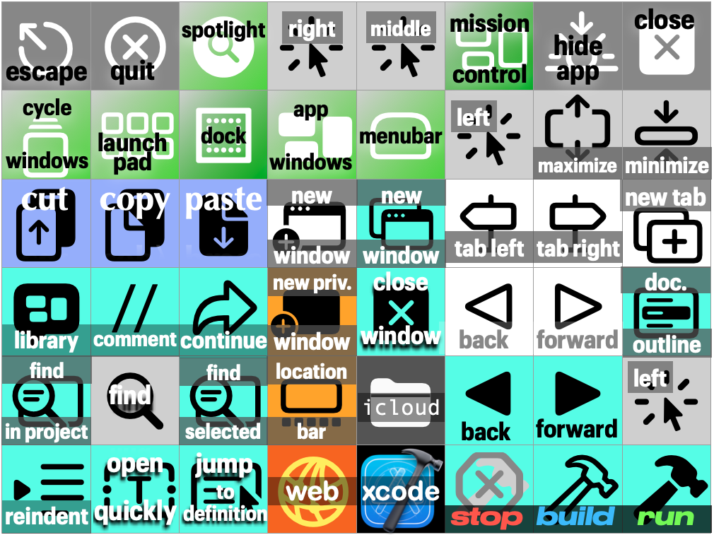 This section explains a Redesign.Codes approach for configuring a programmable keyboard for an IDE, in this case Apple's Xcode. The key arrangement provided here is intended for wide control of the computer. It facilitates movement across the IDE, apps, windows, tabs, and the web. There is a key that switches back to Xcode from any other app. You don't leave yourself just with a set of macros for the IDE because you will want the macro keyboard to help you elsewhere.